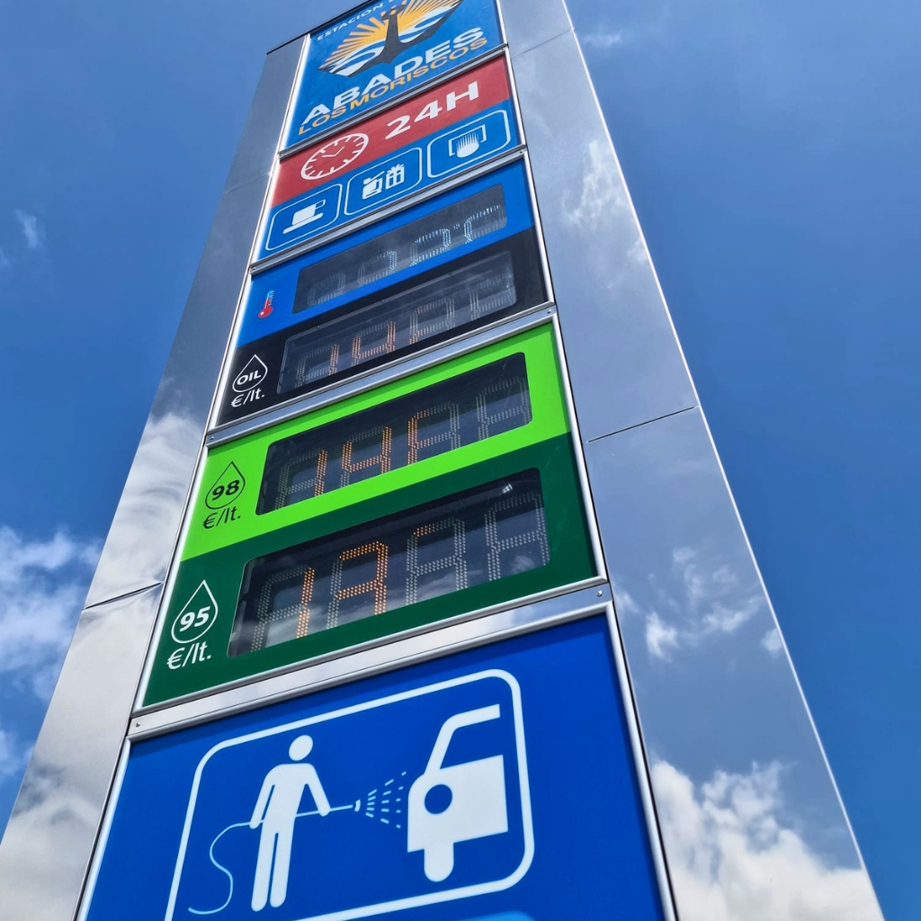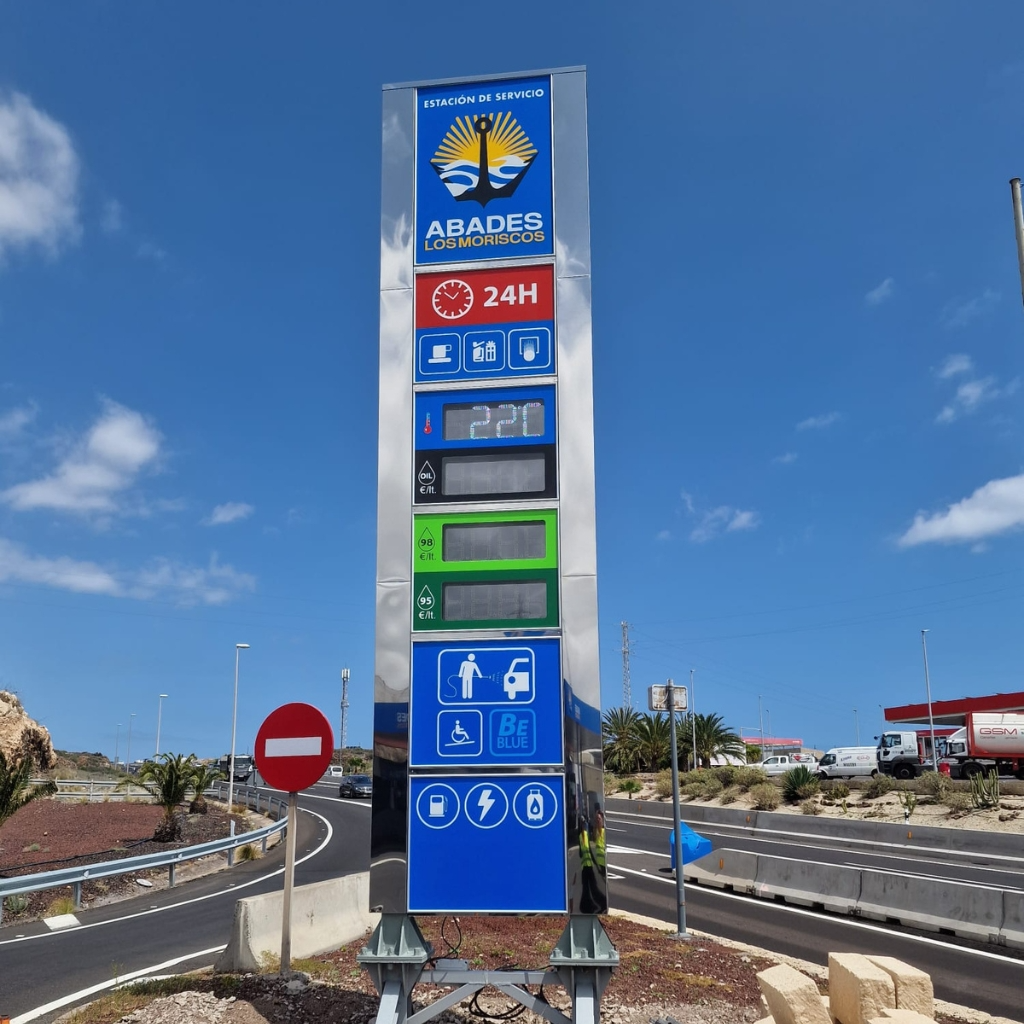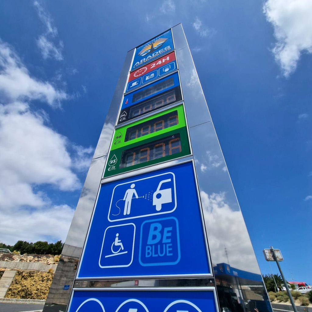 Se trata de un elemento clave de señalización exterior, diseñado para ofrecer máxima visibilidad en carretera, facilitar la información al usuario y reforzar la identidad de la estación de servicio.