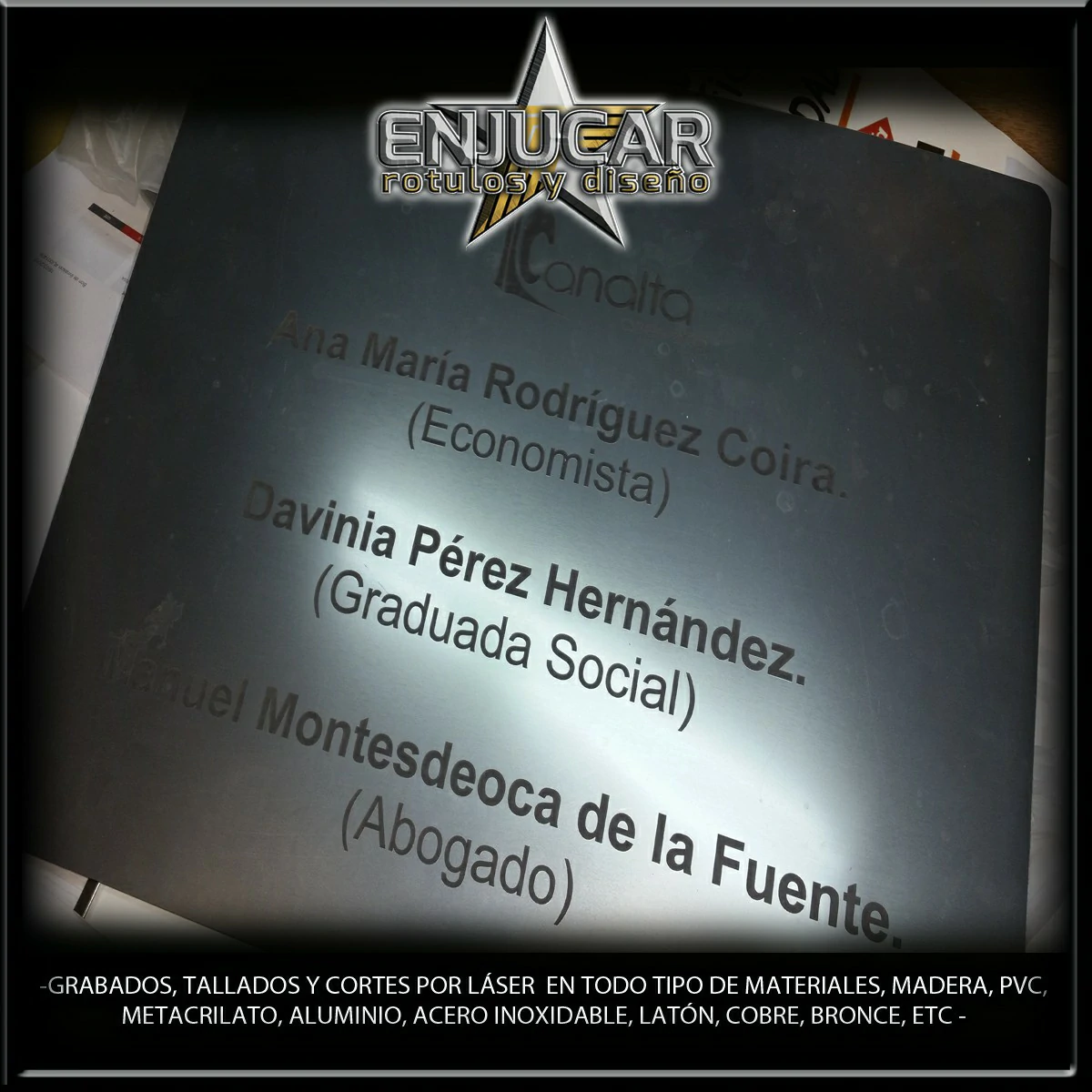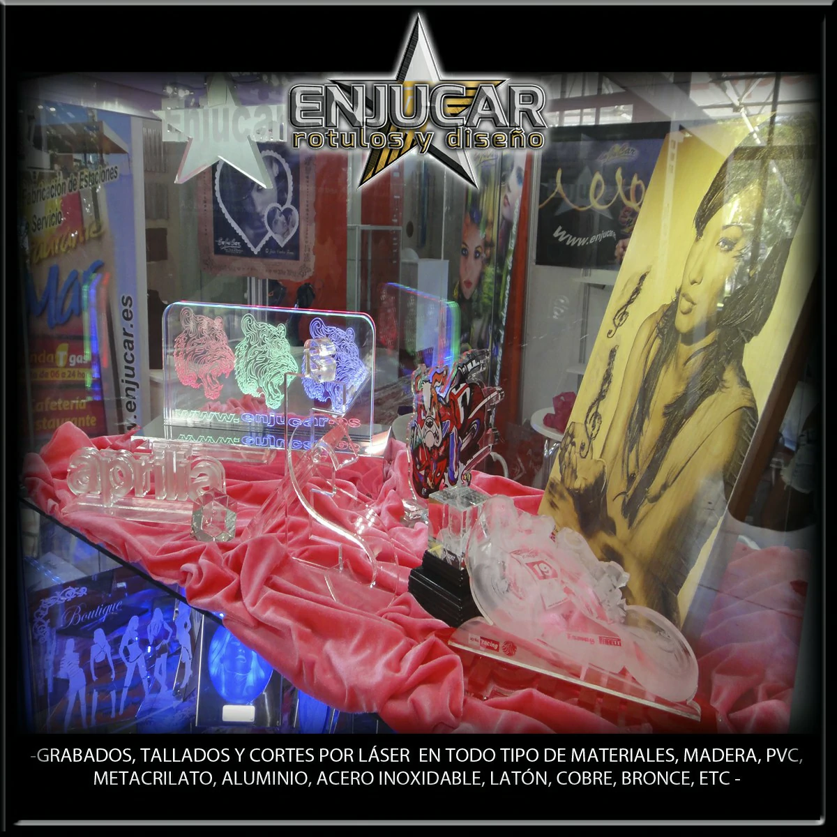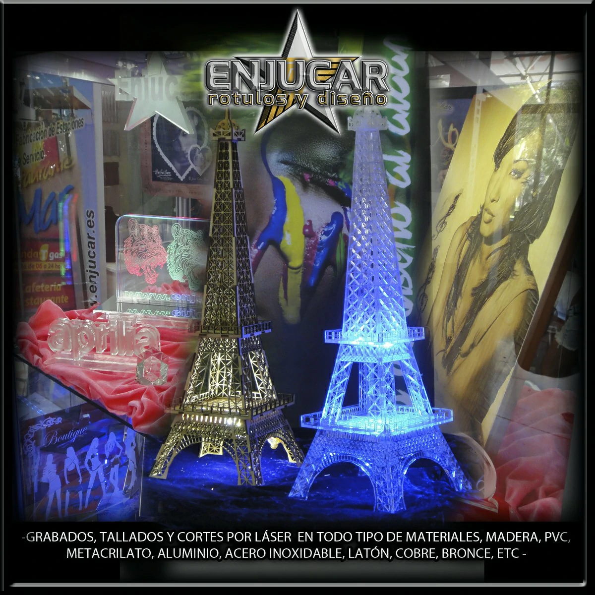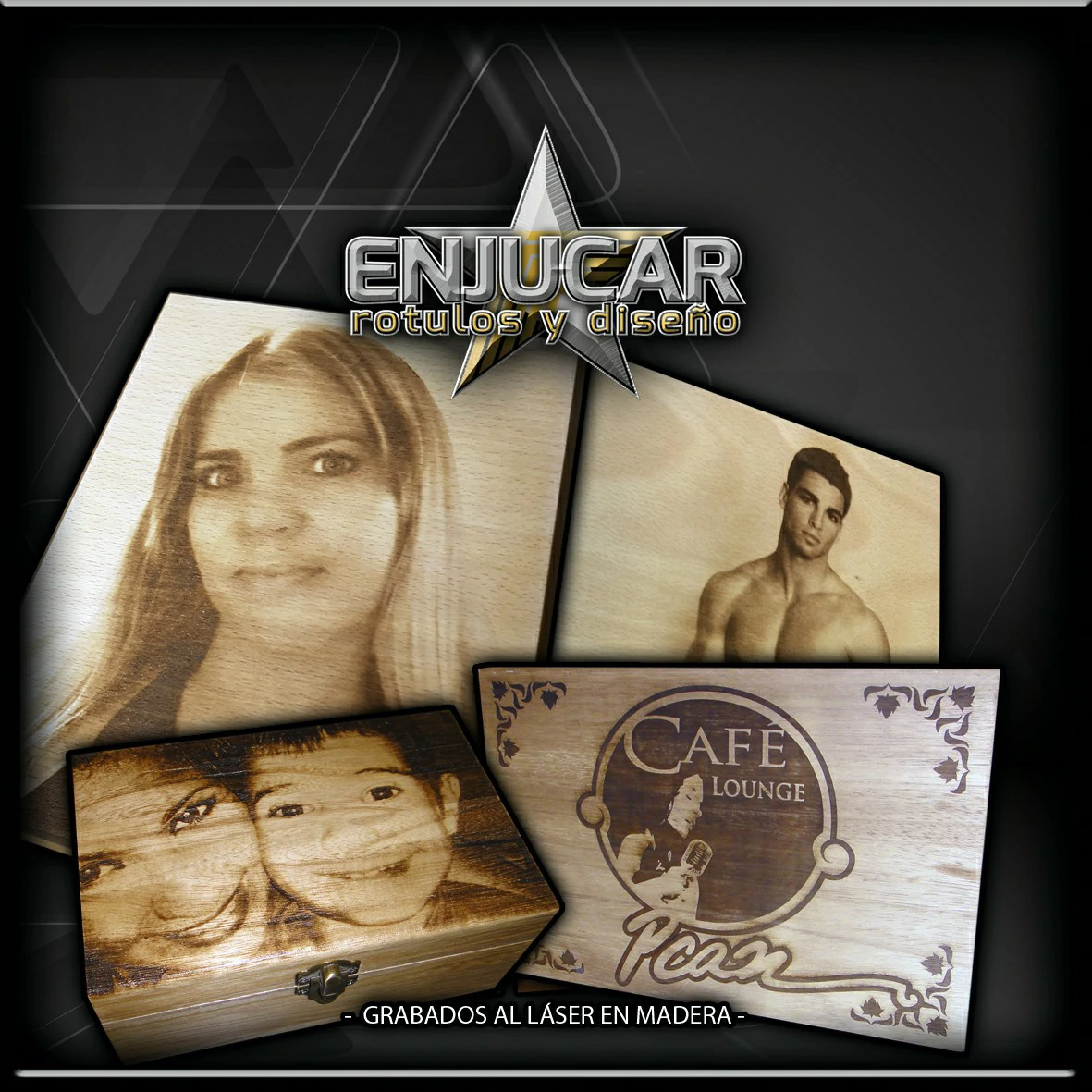 Ofrecemos soluciones precisas de grabado, corte y tallado láser en materiales como madera, piedra, cristal, espejos, cuero, tela, cartón, papel, placas metálicas, y más.