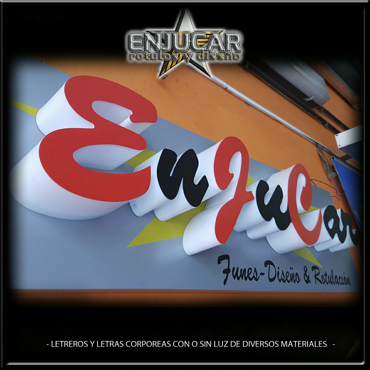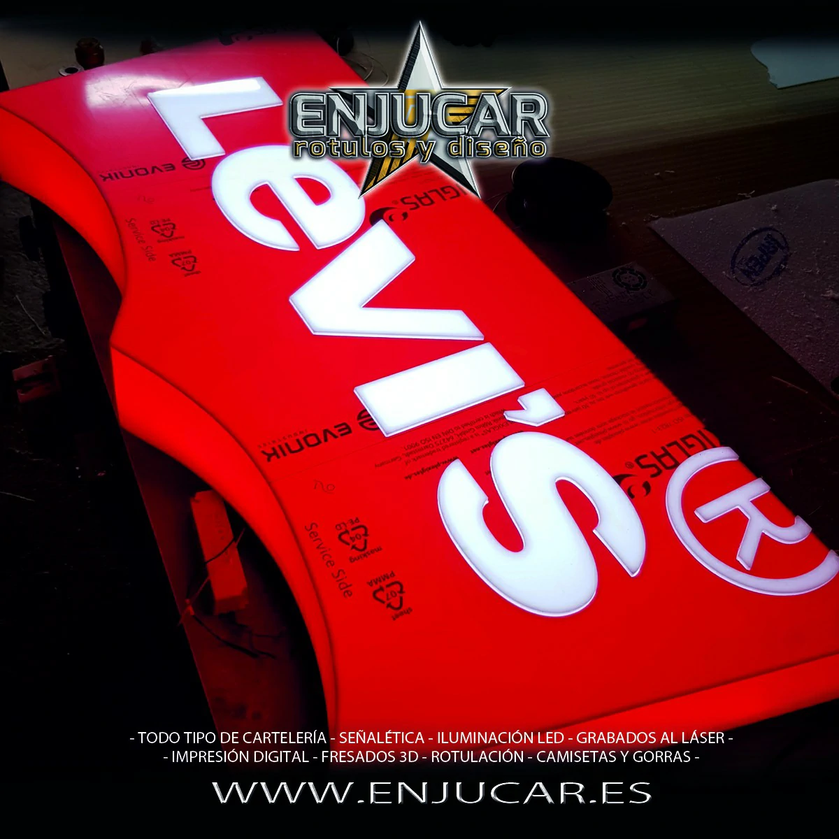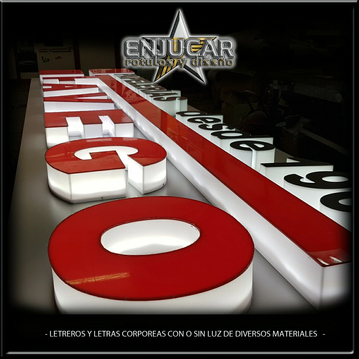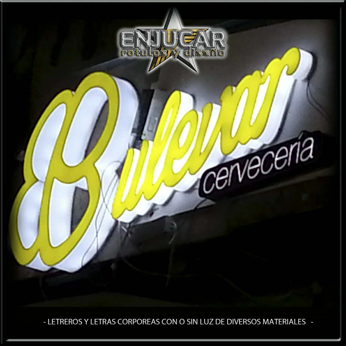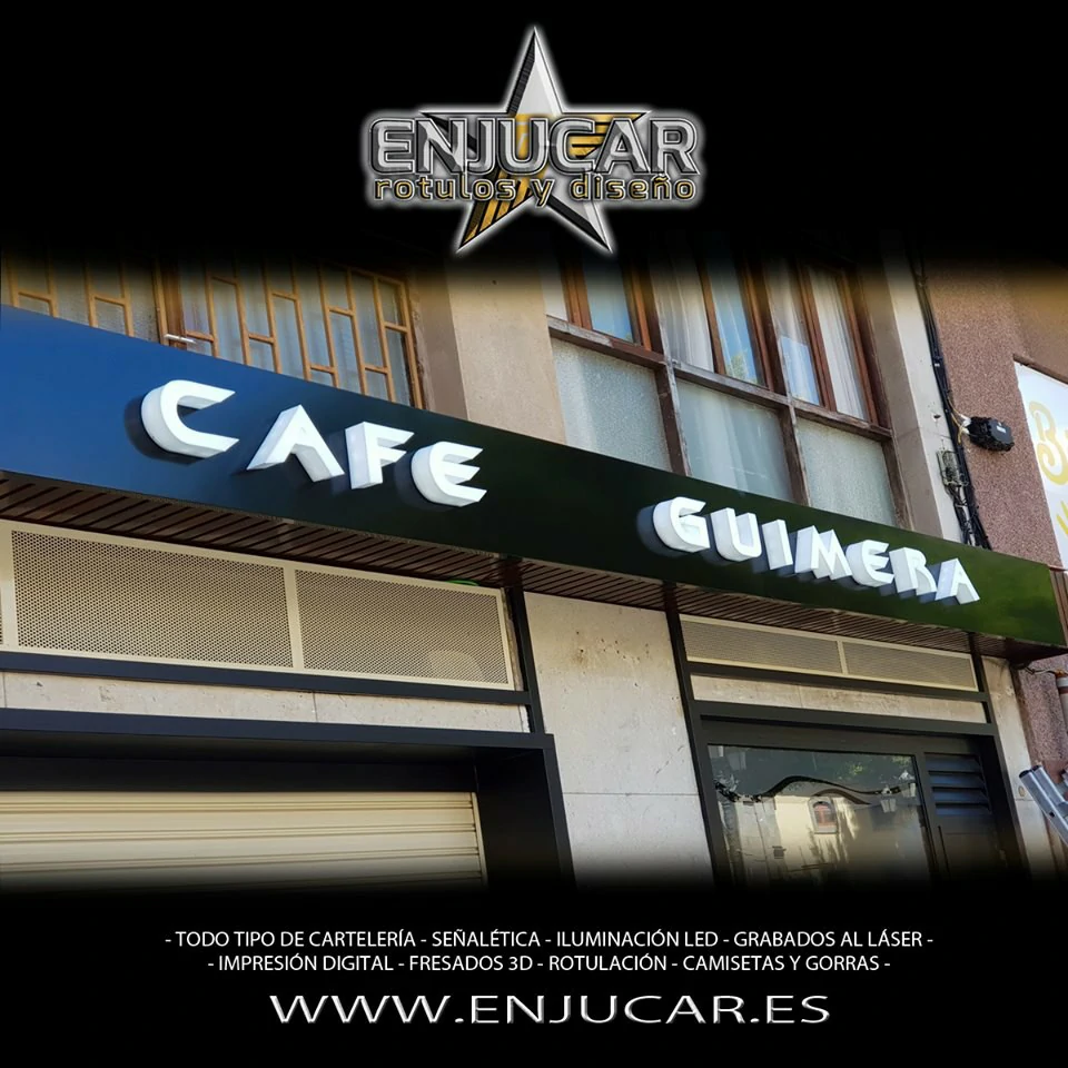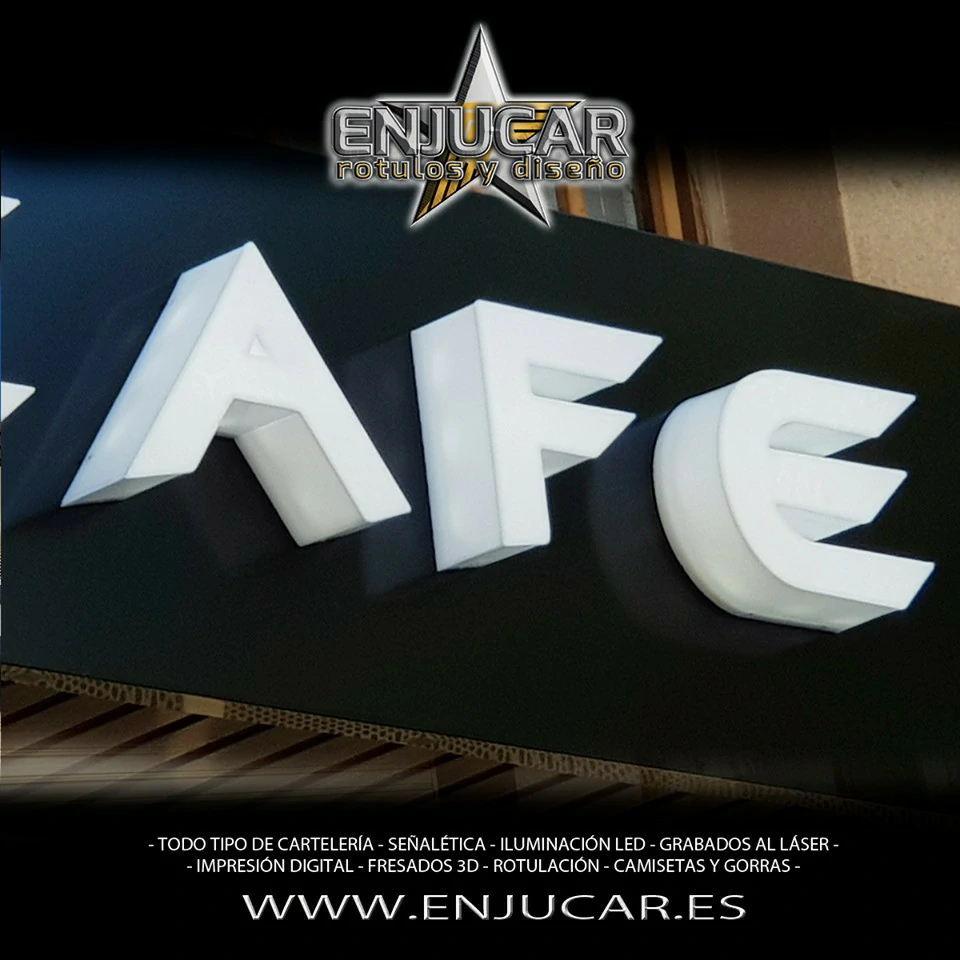 En Rótulos Enjucar damos vida a tu marca con letreros corpóreos con luz, ideales para destacar tanto de día como de noche.
