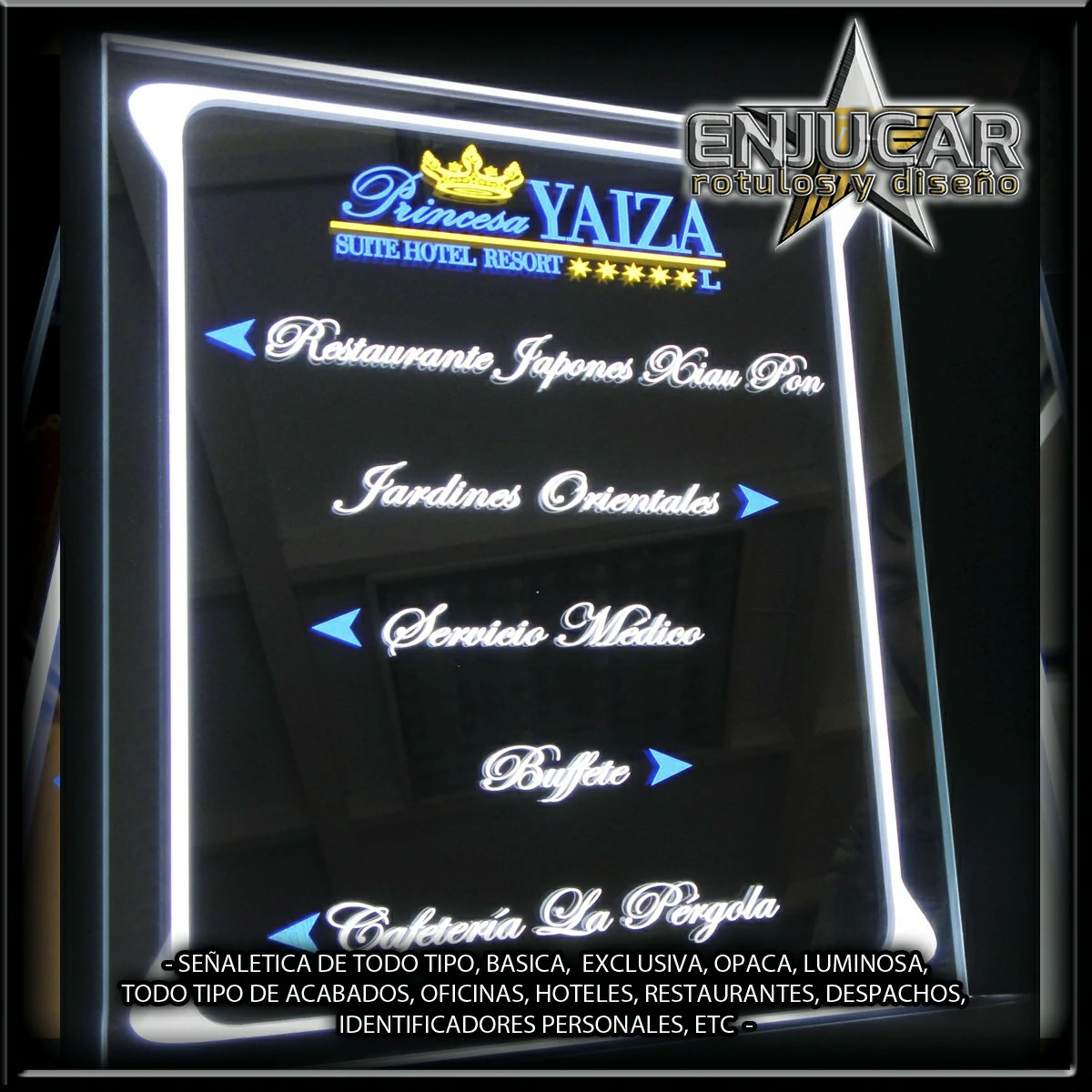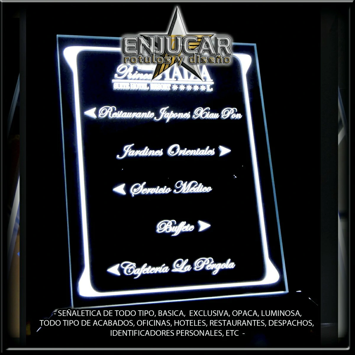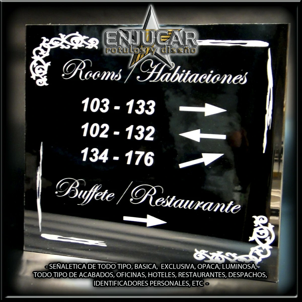 Ofrecemos soluciones para hoteles, apartamentos, hostelería, oficinas y cualquier otro entorno. Desde indicadores de número de habitación, directorios de servicios y señalización de personal, hasta señalética para despachos, turnos, normativas y especialidades.