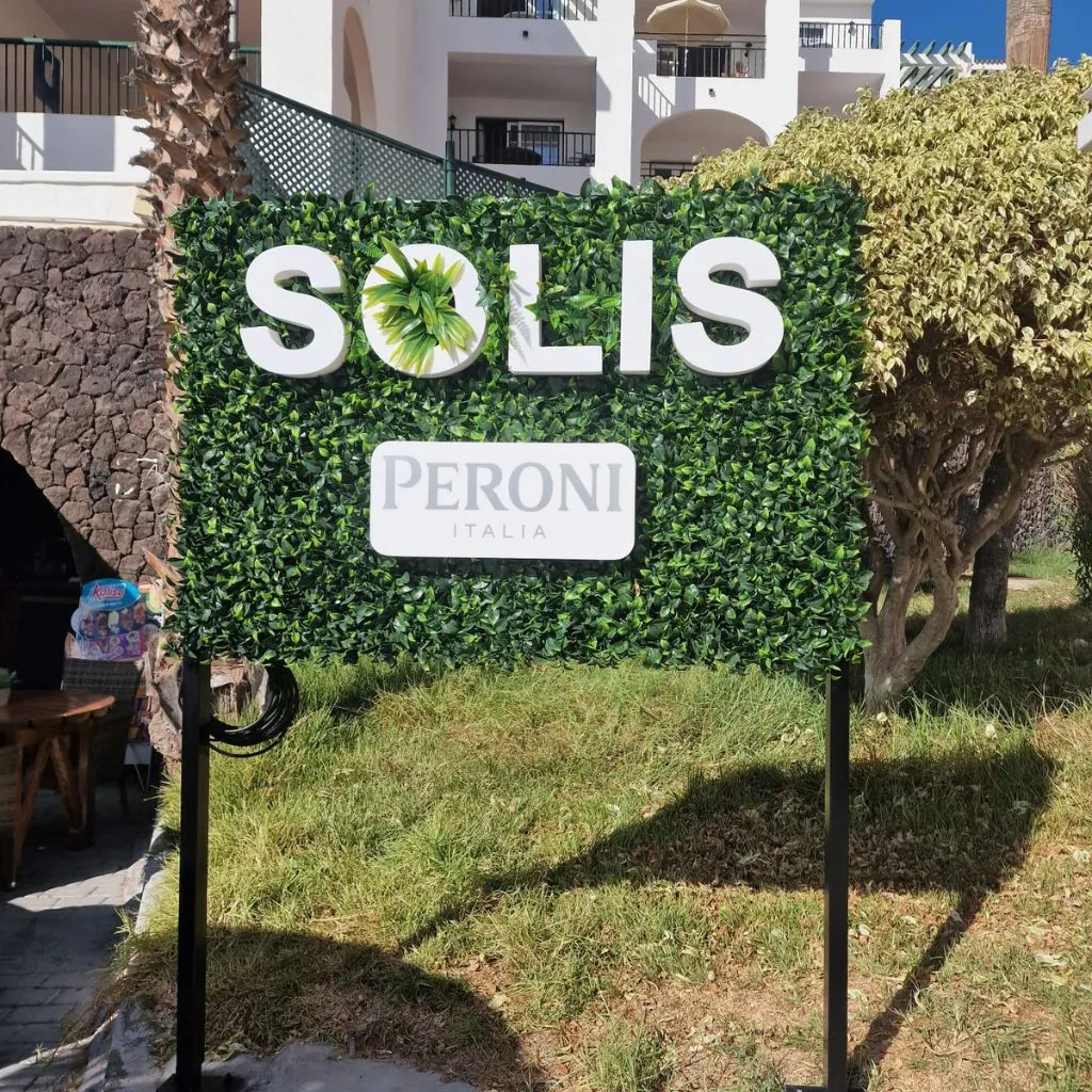 Cartel de bienvenida con relieve 3D, fabricado en letras corpóreas sobre un fondo vegetal sintético, acompañado del logotipo de Peroni Italia. Este conjunto crea una imagen atractiva, natural y elegante, ideal para recibir a los clientes y reforzar la identidad visual del establecimiento.